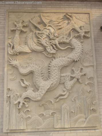 Overview of the giant mural on the outside of the Ming Tombs Museum, depicting and proclaiming the achievements of the Ming Dynasty, among whcih the construction of the Imperial Palace, the lenghtening and restrengthening of the Great Wall of China to the far West, technical inventions in silk weaving and more.