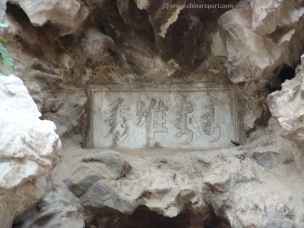 One of the most revered and appreciated features of the Imperial Garden in the Forbidden City is the Hill of Soaring Elegance (DuiXiu Shan ; 堆秀山 ; also Hill of Splendor or Hill of Accumulated Ellegance). It is however, not an element of the original garden first established in 1420 A.D., but an element that was added during the Wanli reign (1572 A.D. - 1620 A.D.) of the Ming Dynasty. The rocks used to create the hill were imported from the Tai Hu (太湖), the famously large lake in the lower reaches of the Yangtze River on the border of Jiangsu and Zhejiang Provinces, which is famous for rocks with grotesque and abstract forms. Two stone carved dragon heads stand guard in front of the Hill and a stone to the left of the entrance to the Hill is inscribed with the two Chinese characters with the meaning "Cloud Root", in the handwriting of Qing Dynasty Emperor Qianlong who was a proliferous caligrapher. Another inscription by him can be found nearby in the garden at the Hall of Literary Elegance.