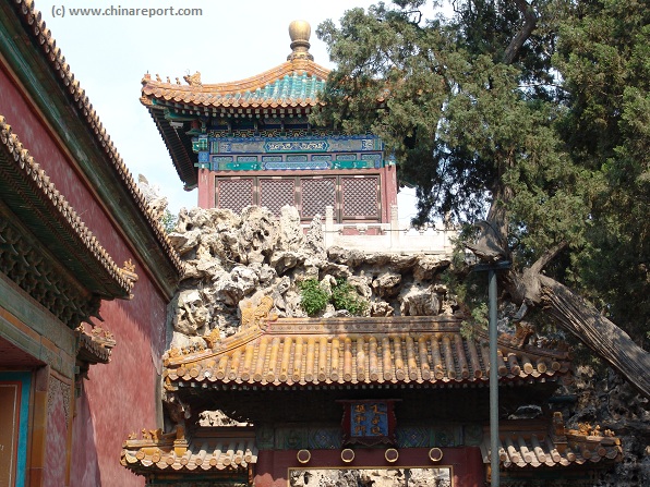 decoration but first and foremost an important element needed to balance out the Feng Shui of the garden and to protect the Garden from negative influences. With its height and bulk planted squarely in the way, the 20 structures within the Garden are shielded from influences deriving from the North. On a larger scale, this function of blocking evil from the north is mirrored by the much larger Coal Hill (Jingshan) which stands immediatly North of the Palace, across from the Northern Gate. It has a similar blocking function as opposed to the Gate of Divine Military Might, which it shields from the feared northern emanations.