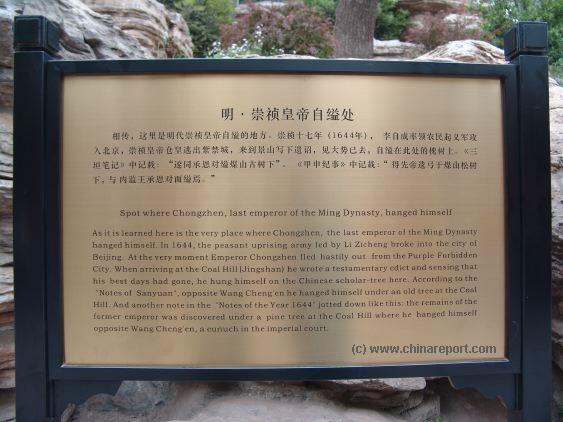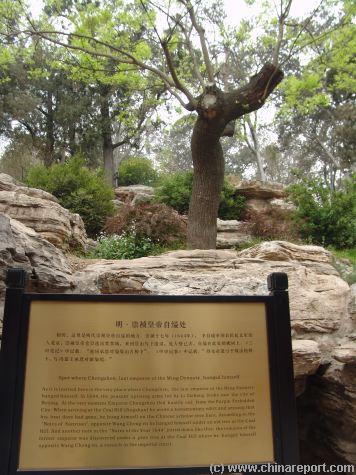 Memorial Plaquette and the Tree on the spot where the Chongzhen Emperor commited suicide.