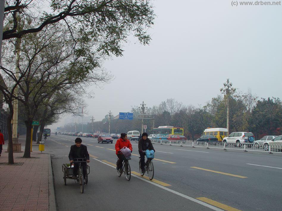 Bicyclist pedal away along West Chang An Avenue in November 2004, as they have done since human memory. Today however, electrically powered bicycles are popular, and almost the norm.