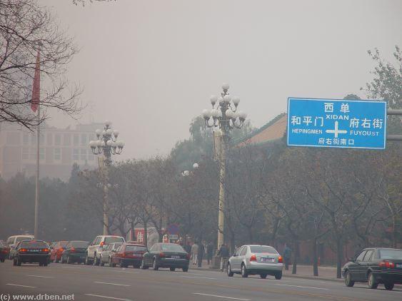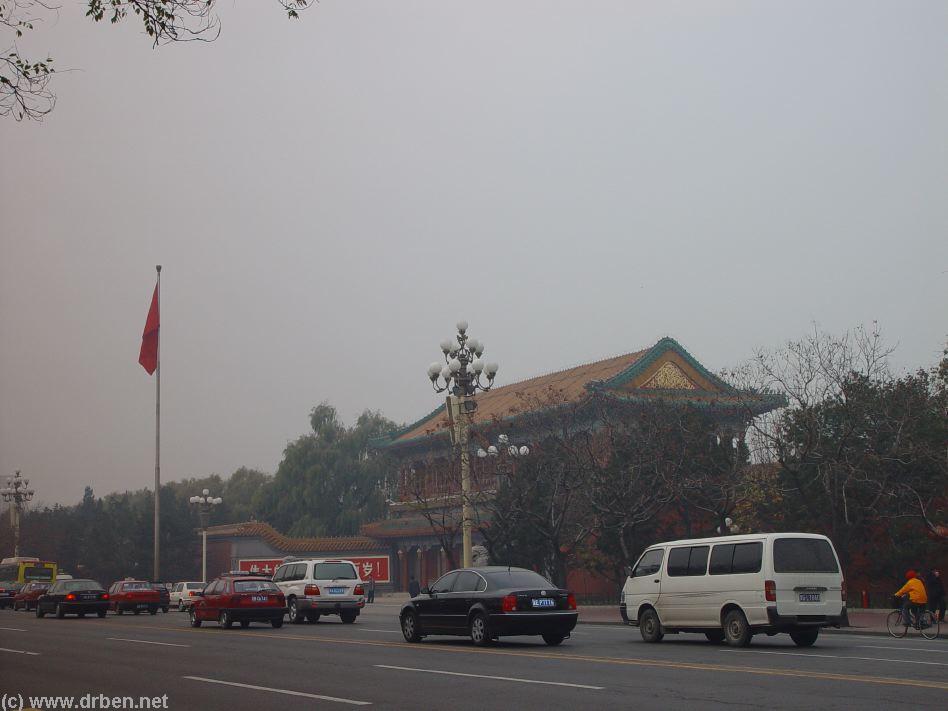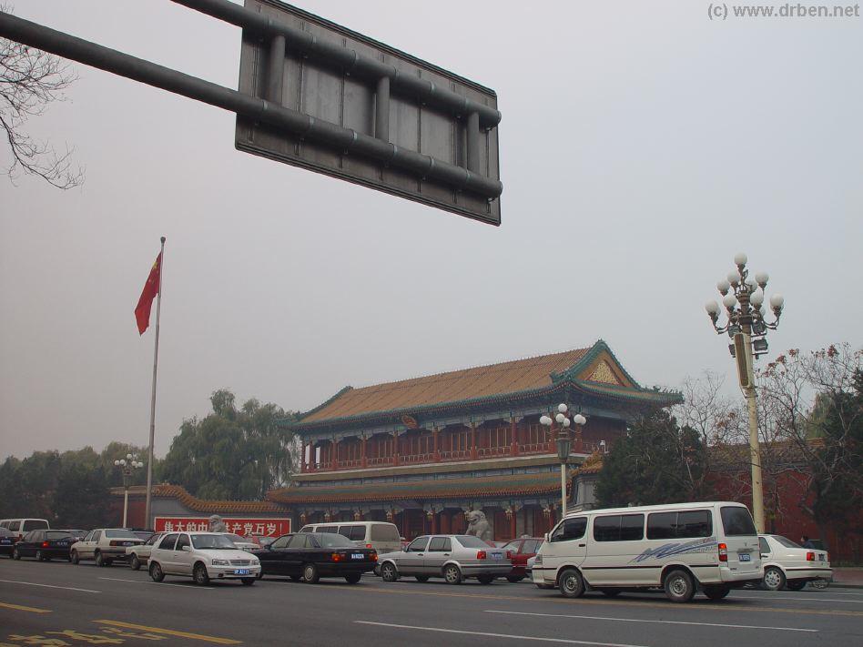 road only, and on the north side the tell-tale purple chalked wall. Follow it onward along the boulevard, and likely iddling cars and buses in an endless traffic jam, until suddenly the roofings of the Gate of New China become visible above the smog and the trees. You have found it ! Take some nice photos if the traffic will allow for its. Unfortunately, there is no pedestrain tunnel to cross underneath the Boulevard of Eternal Peace, so one has to