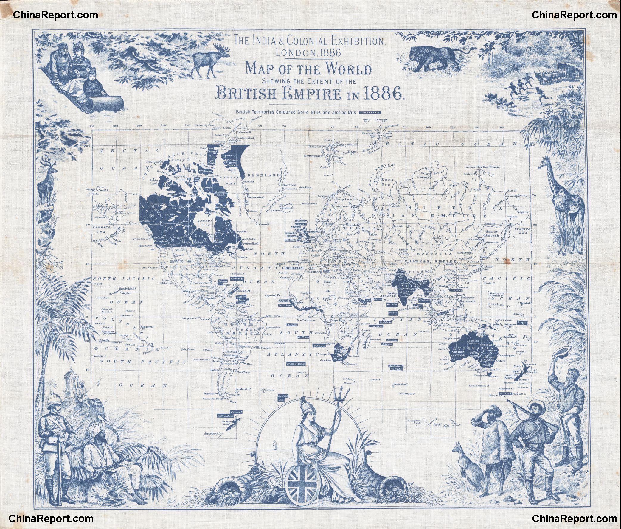 This Map of 1860 AD depicts the British Colonial Empire in the year 1860 AD. The American Colonies have declared themselves independent from the British Empire after a War. The overseas Empire is expanding rapidly into Africa, the middle-East, South-East and now East Asia and China. Especially marked ( in green) the Area of East-Asia relevant to this Website.